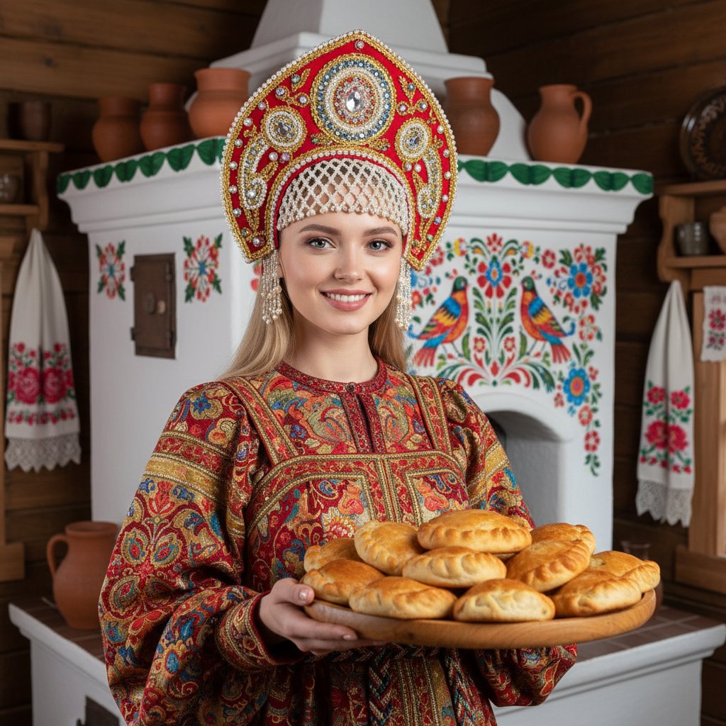 Девушка в нарядном сарафане с поясом и головном уборе, украшенном самоцветами, на фоне старинной расписной печи. Она держит поднос с румяными пирогами, тепло улыбаясь в объектив. За ней — уютный интерьер избы с народными узорами, рушниками и глиняной утварью. Мягкий свет подчеркивает её образ и атмосферу домашнего очага.