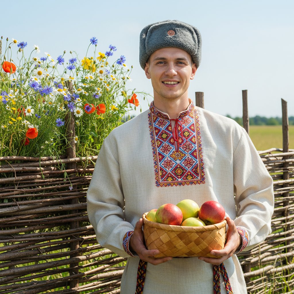 Мужчина в народном русском наряде, в ушанке и вышитой рубахе, стоит у забора из прутьев, украшенного полевыми цветами. Он держит в руках корзину, полную спелых яблок, и смотрит в объектив с доброй улыбкой. Снято на среднем плане в ясный летний день.