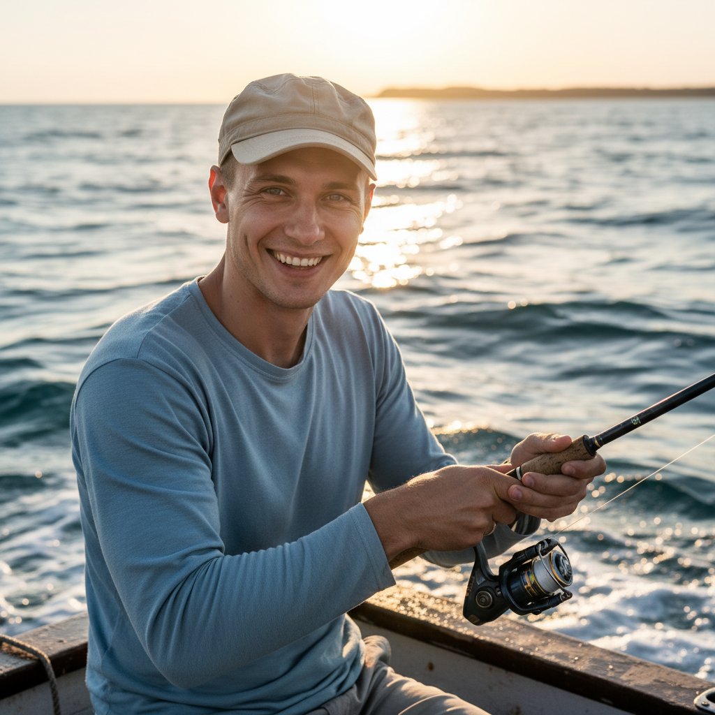 Рыбак в светлой одежде на корме лодки, с удочкой в руках, с улыбкой смотрит в объектив. На заднем плане — морские волны и солнечный горизонт. Снято крупным планом, подчеркивая естественность и атмосферу активного отдыха.