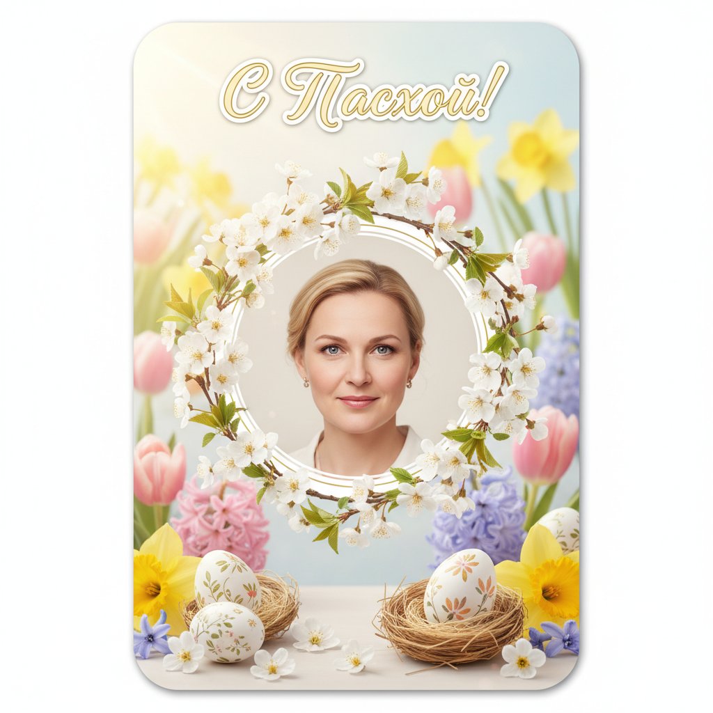 Создай праздничную пасхальную открытку, используя мое фото как главный элемент композиции. Сохрани черты лица и естественное сходство. Добавь нежный весенний фон, пасхальные яйца, цветы, мягкий солнечный свет, уютную атмосферу и красивое оформление в стиле открытки. Сделай изображение ярким, аккуратным, реалистичным и эстетичным. Добавь надпись: “С Пасхой!” красивым каллиграфическим шрифтом. Формат вертикальный, высокое качество.