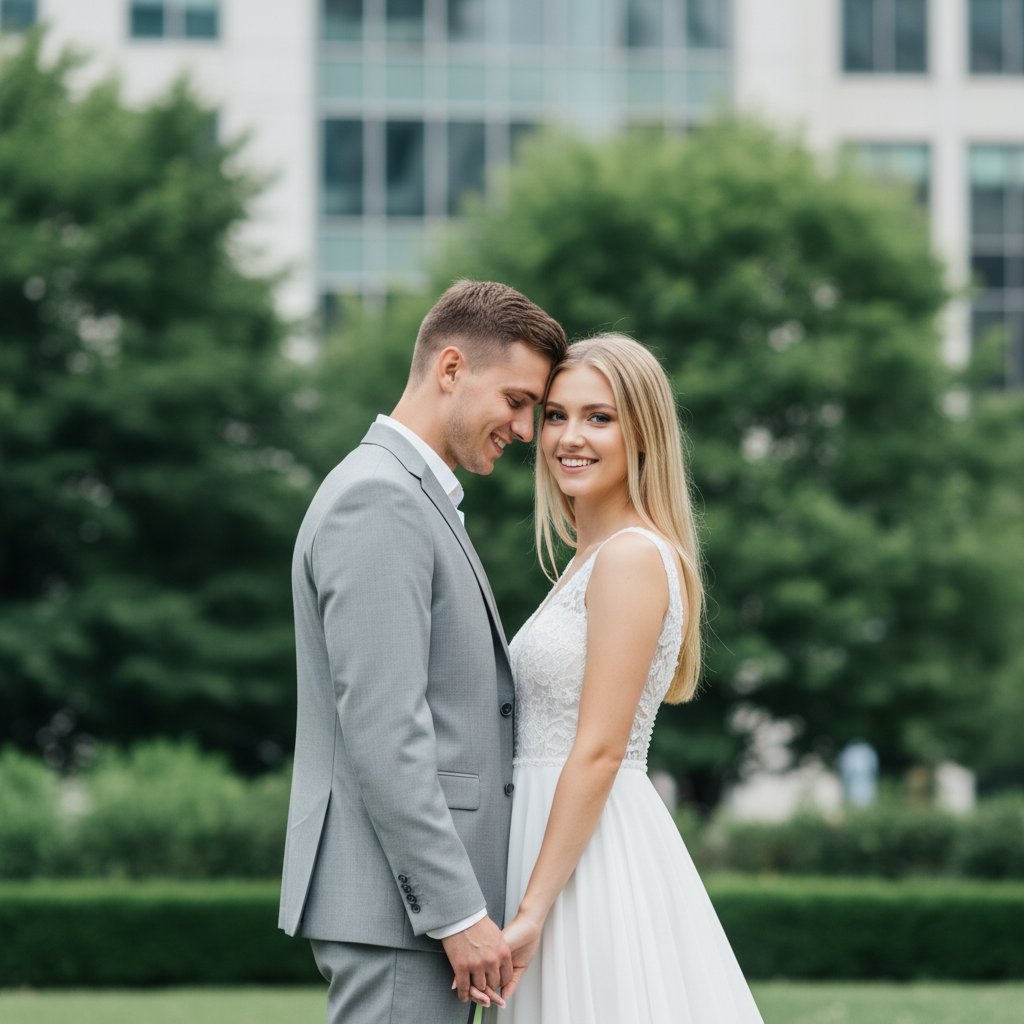 Молодожены стоят лицом к лицу, склонившись друг к другу, их руки соприкасаются, оба смотрят в объектив с улыбкой. На заднем плане видны элементы городской застройки и пышная зелень деревьев. Освещение мягкое, дневное, создающее романтическое настроение.