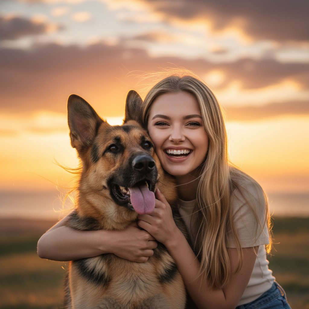 Женщина и немецкая овчарка, обнявшись, смотрят в камеру. Женщина смеется, прижимая голову собаки к своей. У овчарки высунут язык, шерсть развевается на ветру. На заднем плане — закатное небо с теплыми оттенками, подчеркивающее их взаимную привязанность.