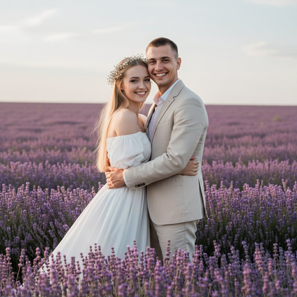 Молодая женщина в струящемся белом платье с открытыми плечами и украшением из цветов в волосах, мужчина в светлом костюме без галстука. Они обнимаются посреди поля цветущей лаванды, их лица озарены улыбками, взгляд направлен в объектив. Нежные сиреневые и зеленые тона создают атмосферу радости и безмятежности.