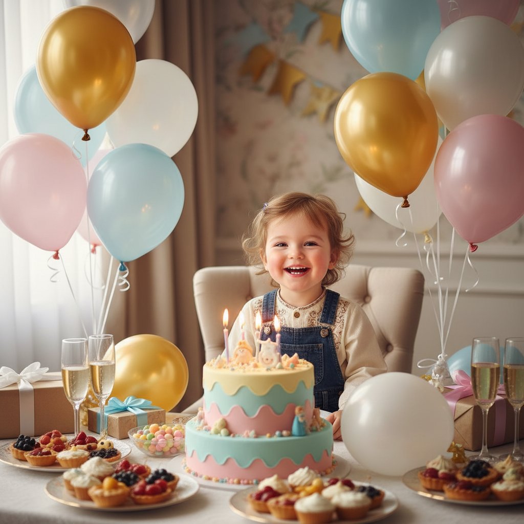 Маленький ребенок радостно улыбается в объектив, сидя у богато сервированного стола. На столе красуется торт и множество воздушных шаров, создавая атмосферу праздника. Освещение — яркое дневное, фон — с мягким фокусом.