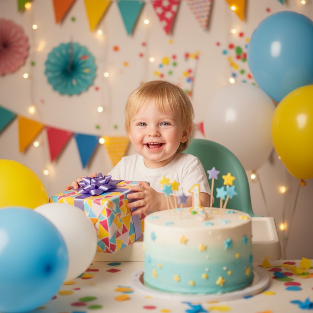 Малыш с сияющей улыбкой за столом, украшенным тортом и воздушными шарами. В руках у него подарок, взгляд направлен в объектив. Задний план украшен гирляндами и праздничным декором.