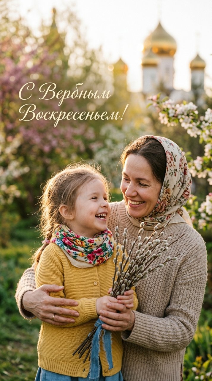NanoBanana 2Тёплая живая сцена для открытки к Вербному воскресенью, семья (мать и ребёнок или пожилая пара) держит в руках пушистые веточки вербы, искренние улыбки, момент общения и радости, весенний день, мягкий естественный свет, золотой час или утреннее солнце, лёгкое свечение, уютная атмосфера, реалистичная фотография, крупный или средний план, акцент на лицах и руках, мягкий размытый фон с эффектом боке, малая глубина резкости, гармоничная композиция с пустым пространством, элегантная надпись на русском «С Вербным воскресеньем» размещена в негативном пространстве, кинематографичный свет, высокая детализация, натуральные цвета, съёмка на 35мм --v 6.1 --stylize 150