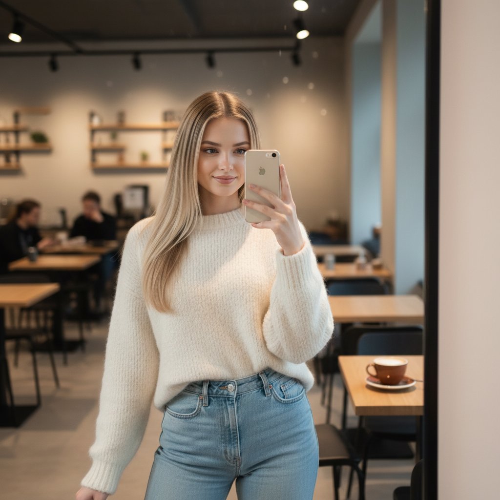 Девушка в джинсах и уютном свитере фотографирует себя в зеркале, на фоне видны столики и чашка кофе.