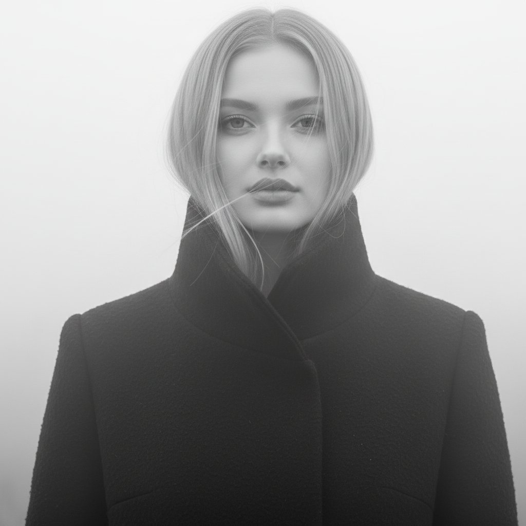 Портрет женщины в элегантном чёрном пальто с высоким воротником, утопающей в плотном тумане. Крупный план лица, прямой взгляд в объектив, лёгкие пряди волос, развеваемые ветром. Фотография выполнена в чёрно-белой гамме, с выраженным контрастом между тёмным силуэтом фигуры и клубящимся белым туманом.