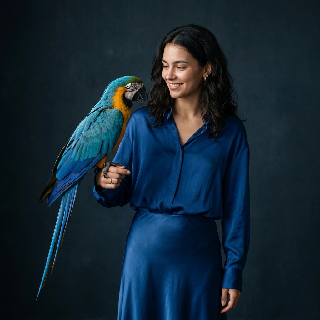 NanoBanana 2Создай портрет, не меняя черты лица. Фэшн-фотография модели с ярким попугаем ара в насыщенных синих и лазурных оттенках, с детализированными перьями. Она взаимодействует с птицей, держа её на руке. На женщине выразительный наряд в синих тонах: свободный топ и длинная юбка с мягким блеском. Глубокая монохромная палитра, минималистичный фон с мягким студийным светом. Гиперреалистичный редакторский стиль высокой моды, 8k, высокая детализация текстур. 9:16