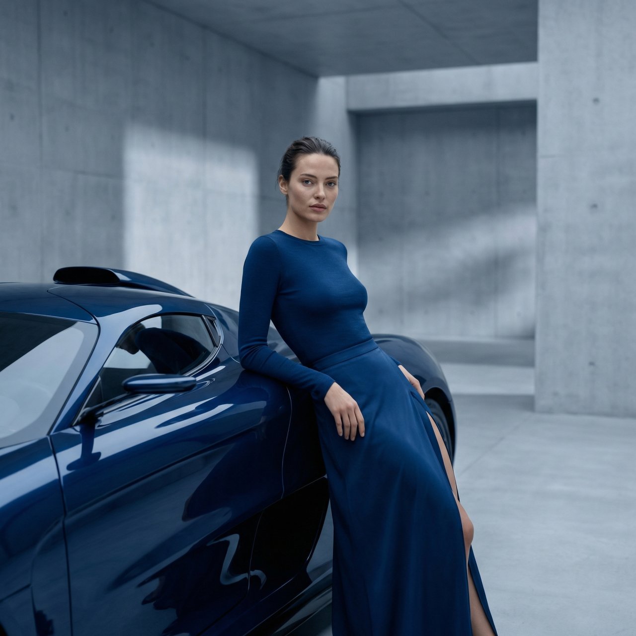 NanoBanana ProСоздай портрет, не меняя черты лица. Фэшн-фотография модели рядом с насыщенно-синим гиперкаром с динамичным силуэтом и глянцевым покрытием. Она опирается на автомобиль, создавая уверенную и расслабленную позу. На женщине наряд в глубоких синих оттенках: облегающий топ с длинными рукавами и юбка с высоким разрезом. Глубокая монохромная палитра, минималистичный фон с мягкими тенями. Гиперреалистичный редакторский стиль, 8k, высокая детализация поверхностей. 9:16
