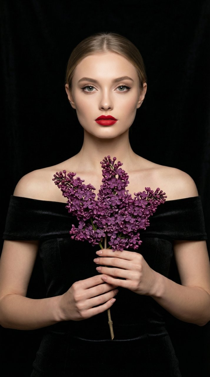 NanoBanana ProИспользуй лицо женщины с загруженного фото. Не меняй черты лица. Композиция: Вертикальный кадр 9:16, классический редакционный портрет. Девушка на черном бархатном фоне. В руках — крупная ветка сирени, расположенная вертикально. Кадр от груди, строгая центральная композиция. Поза: Стоит лицом к камере, корпус прямо. Руки держат ветку сирени вертикально перед собой, цветы на уровне груди. Голова прямо, взгляд направлен в камеру, выражение спокойное, уверенное. Одежда: Черное бархатное платье с открытыми плечами, плотно облегающее. Ткань с глубоким матовым глянцем, поглощающим свет. Макияж: Классический редакционный. Кожа матовая, с видимой текстурой. Глаза с черной подводкой, образующей крыло, растушеванной. Тени нейтральные. Ресницы объемные. Губы с красной матовой помадой. Прическа: Длинные волосы собраны в низкий гладкий пучок на затылке. Волосы блестящие, уложены идеально. Сирень: Ветка темно-фиолетовой сирени с крупными плотными соцветиями. Лепестки с бархатистой текстурой, созвучны текстуре бархата. Видны тычинки, прожилки. Свет падает сверху, создавая объем на цветах. Технические параметры: Phase One IQ4, объектив 105 мм, диафрагма f/3.5, RAW. Освещение — верхний софит, создающий мягкие тени. Максимальная детализация текстур кожи, бархата и лепестков сирени. Отсутствие beauty-ретуши, пластиковый эффект исключен. Сирень натуральных пропорций.