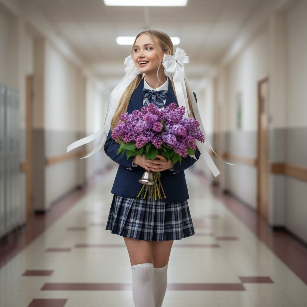 Крупный план: девушка в школьной форме с двумя пышными бантами и лентой, идет по коридору, держа в руках букет сирени и звонок. Ее взгляд направлен в сторону, на лице читается волнение и радость.