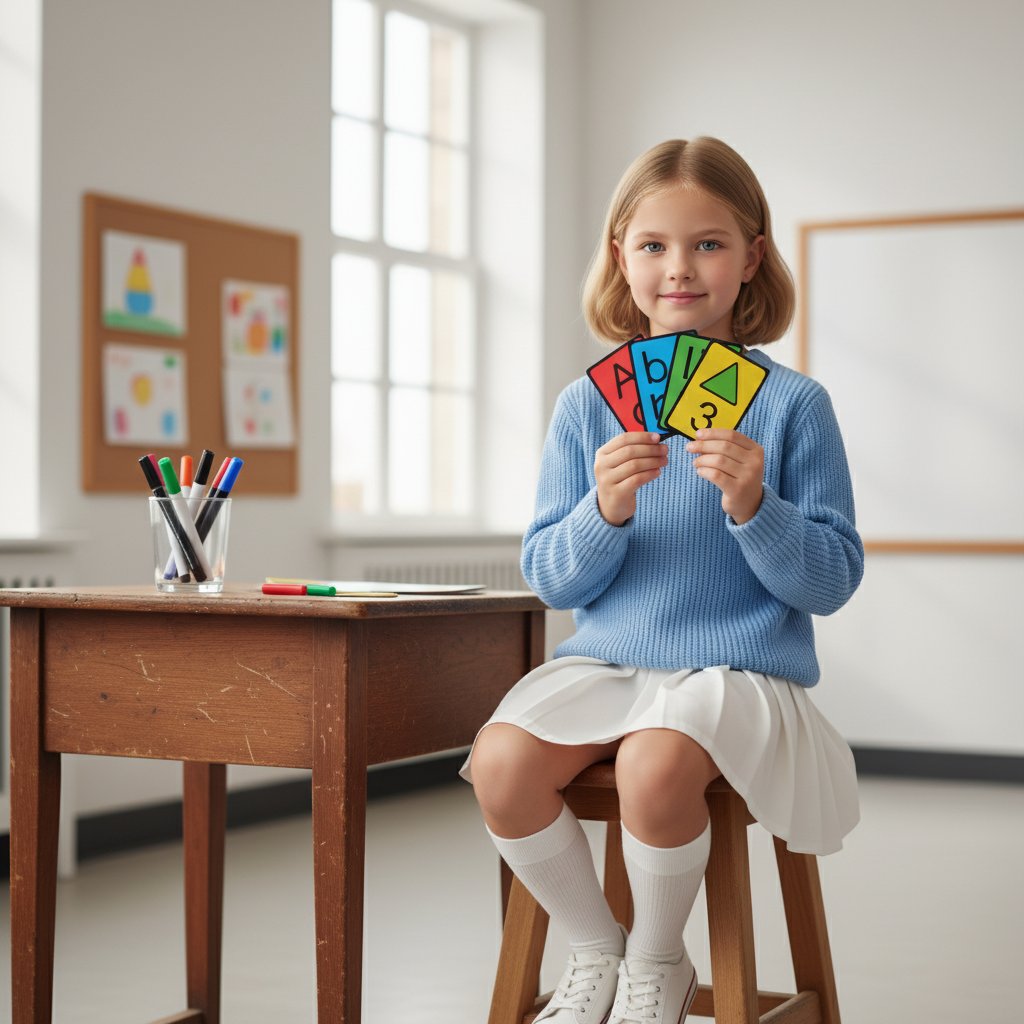Девочка в голубом джемпере и белой юбке сидит на высоком стуле возле стола учителя, держа в руках разноцветные карточки, взгляд направлен прямо в камеру. На заднем плане — простой, светлый класс. На столе стоит стакан с маркерами.