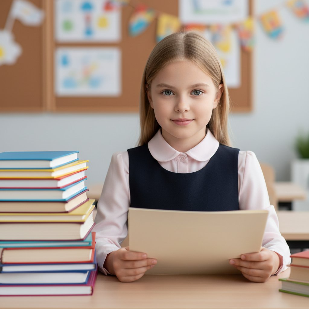 Девочка в опрятной рубашке пастельных тонов и скромном школьном платье сидит за стопкой книг на светлом столе. Она держит в руках папку для документов, кадр среднего плана, прямой взгляд в объектив, атмосфера праздника знаний.