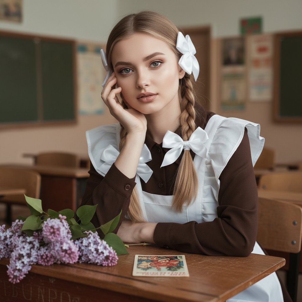 Портрет девушки в советской школьной форме, украшенной белым фартуком и пышными бантами. Она сидит за партой, подперев щеку рукой, и смотрит прямо в объектив. На парте рядом с ней — букет сирени и небольшая открытка. Снято крупным планом, атмосфера передает дух советской эпохи.
