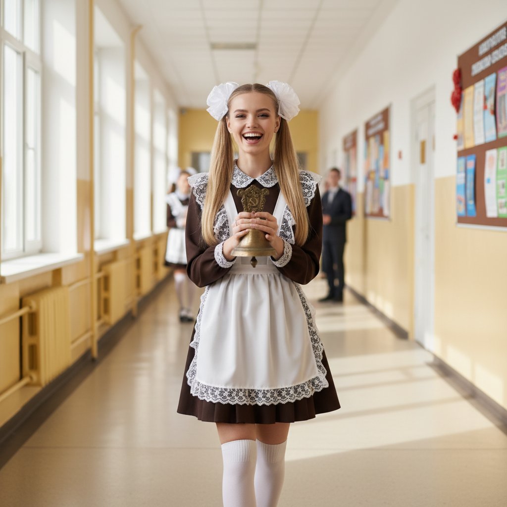 Юная девушка в школьной форме, белых гольфах и с бантами, идет по школьному коридору, смеясь в камеру. В руках она держит старинный советский звонок. Снято крупным планом, передает атмосферу праздника и живую энергию.