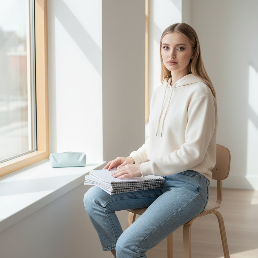 Девушка в светло-кремовом худи и голубых джинсах сидит на высоком стуле у окна, складывает тетради стопкой, смотрит в объектив. Минималистичный светлый интерьер класса, на подоконнике только пенал.
