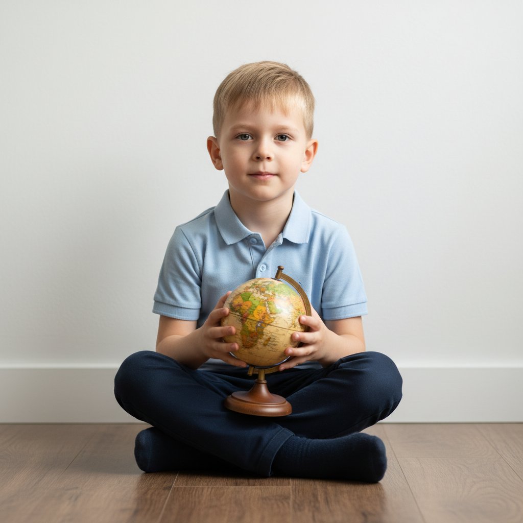 Мальчик в элегантной голубой рубашке-поло и темных брюках сидит на полу, скрестив ноги. В руках он держит глобус. Фон – светлая, лаконичная стена. Снято на среднем плане, объектом съемки является ребенок, смотрящий в камеру. Атмосфера вдохновения к учебе.