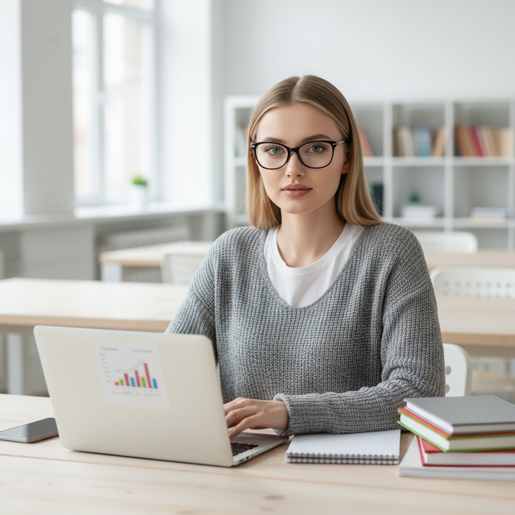 Женщина в очках, одетая в повседневную одежду, работает за ноутбуком в учебном пространстве. Рядом видна стопка учебных материалов. Она смотрит прямо в камеру с выражением спокойной уверенности. Фокус на крупном плане, подчеркивающий современный и гибкий образ педагога.