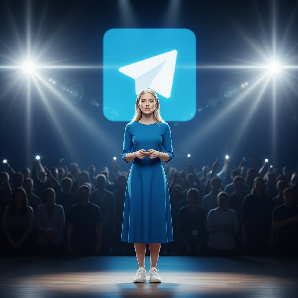 Женщина-оратор в синем платье-миди и кроссовках позирует на сцене, обращаясь к аудитории. На ней гарнитура, позади видны прожекторы, размытые силуэты зрителей и логотип Telegram. Снято со среднего ракурса.