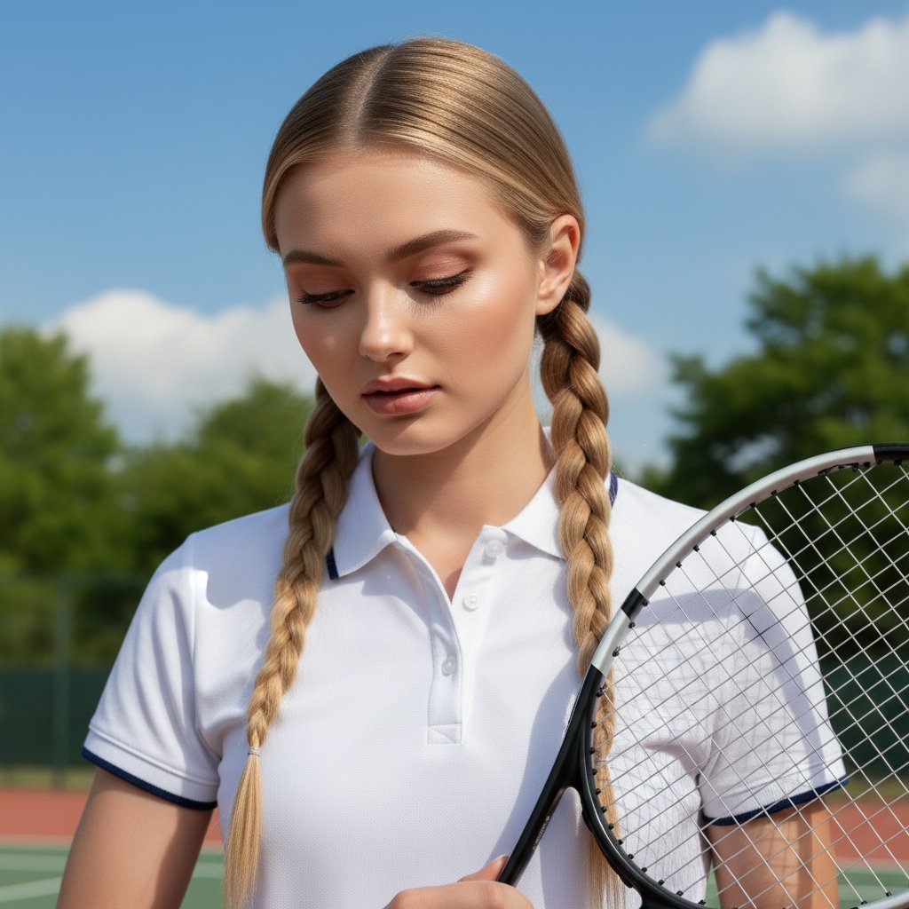 Портрет девушки с косами, держащей теннисную ракетку. Её пальцы свободно обвивают рукоятку, а взгляд опущен вниз, словно она восстанавливает дыхание после напряжённого момента игры. На заднем плане виднеются голубое небо и зелень деревьев. Снимок крупным планом, передающий её природную красоту и спортивную энергию.