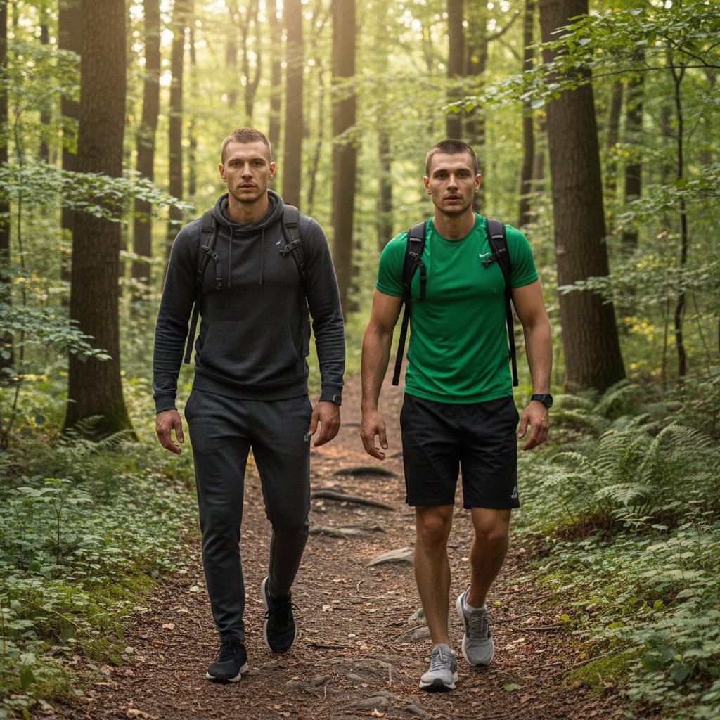 Двое мужчин, только что завершивших тренировку, идут по лесной тропе, оба смотрят прямо в объектив. Один одет в темно-серый спортивный костюм с длинными рукавами и черные кроссовки. Второй — в зеленую футболку, черные шорты и серые кроссовки для бега. Оба несут рюкзаки на плечах.