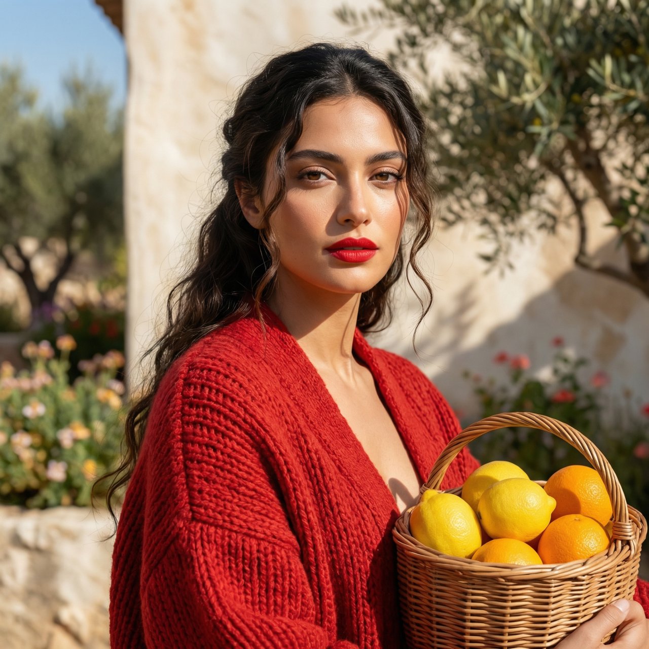 NanoBanana ProСоздай портрет, не изменяя черты лица, Фотореалистичный портрет красивой женщины с выразительными чертами лица, глубокими глазами и ярко-красными пухлыми губами. На ней объемный, свободный пушистый красный вязаный кардиган спущенный с плеч. Она держит в руках плетеную корзину, полную спелых желтых лимонов и апельсинов. Безупречный макияж, волосы длинные волнистые собранны сзади, небрежные пряди у лица. Освещение - яркий солнечный свет с контрастными тенями (кинематографичный свет), создающий атмосферу средиземноморского полдня. Задний план: светлая стена и размытая зелень сада. Высокая детализация кожи, текстуры ткани и плетения корзины.9:16