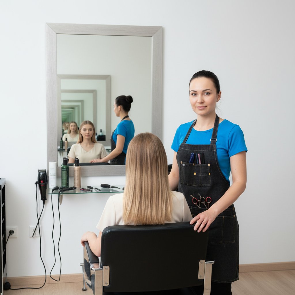 Женщина-парикмахер в голубой футболке и темном фартуке стоит рядом с клиентом в кресле. Оба спокойно смотрят в камеру. На фоне — современное оборудование салона, зеркала, инструменты.