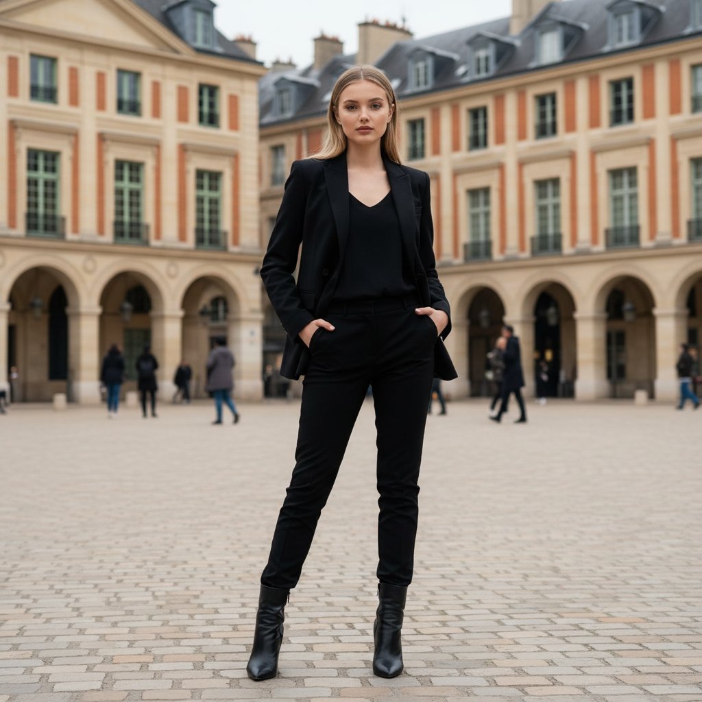Женщина в элегантном черном пиджаке и модных сапогах позирует на площади Вогезов, руки в карманах, взгляд уверенно направлен в объектив. На заднем плане видны исторические кирпичные здания с аркадами, передающие атмосферу старого Парижа. Кадр крупным планом, акцентирующий контраст между современной модой и вечной архитектурой.