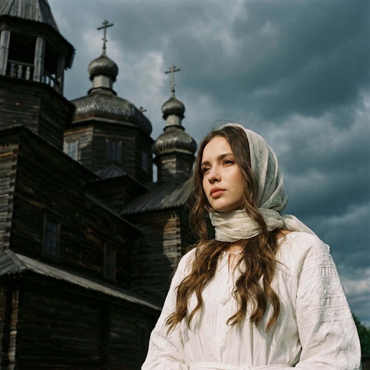 NanoBanana ProСоздай крупный портрет, не меняя черты лица. фотография : молодая женщина в традиционном белом платьесветлом платке на голове. У нее длинные волнистые волосы, безупречный макияж. Она стоит на фоне величественного деревянного храма со множеством куполов и крестов. Драматичное облачное небо с фактурными облаками. Стиль высокой моды (high fashion), высокая детализация текстуры ткани. Освещение: Естественный свет, сильный контраст между глубокими тенями здания и ярко-белой одеждой. Атмосфера: Готическая эстетика, фольклор, сюрреализм, торжественность. Технические параметры: Пленочное зерно (film grain), высокая четкость.Максимальная детализация, 8k."