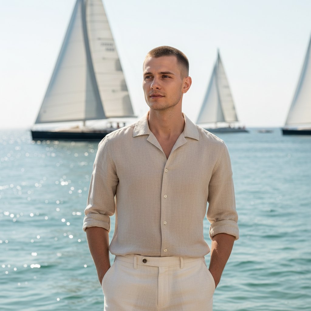 Крупный план: элегантный мужчина в светлой льняной рубашке и шортах, руки в карманах, взгляд устремлен вдаль. На фоне видны белоснежные паруса яхт и безмятежная гладь моря. Фотография передает атмосферу роскошного отдыха и утонченного стиля.