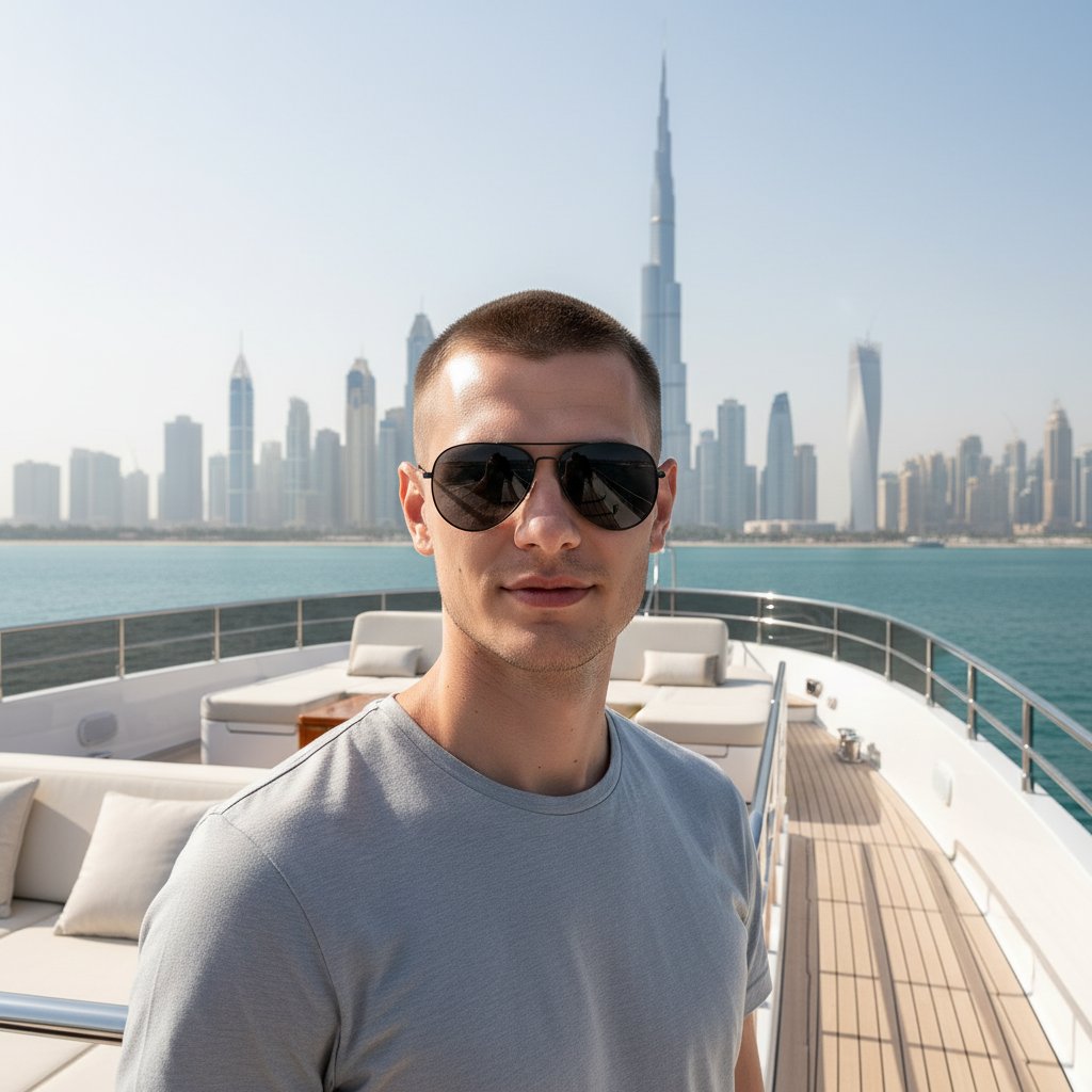 Молодой человек в модных солнцезащитных очках позирует на палубе роскошной яхты. На заднем плане раскинулся футуристический горизонт Дубая с его знаменитыми небоскрёбами. Он смотрит прямо в объектив камеры.