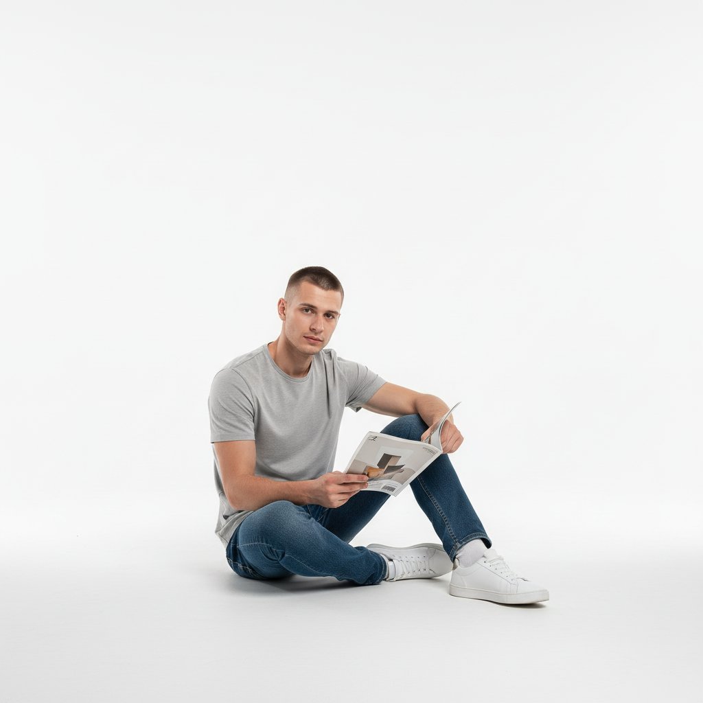 Молодой мужчина в минималистичной одежде сидит на белом фоне циклорамы, уверенно глядя в объектив. Он держит в руках современный журнал, его поза непринужденна. Снимок выполнен в студии с акцентом на чистоту линий и светлое пространство.