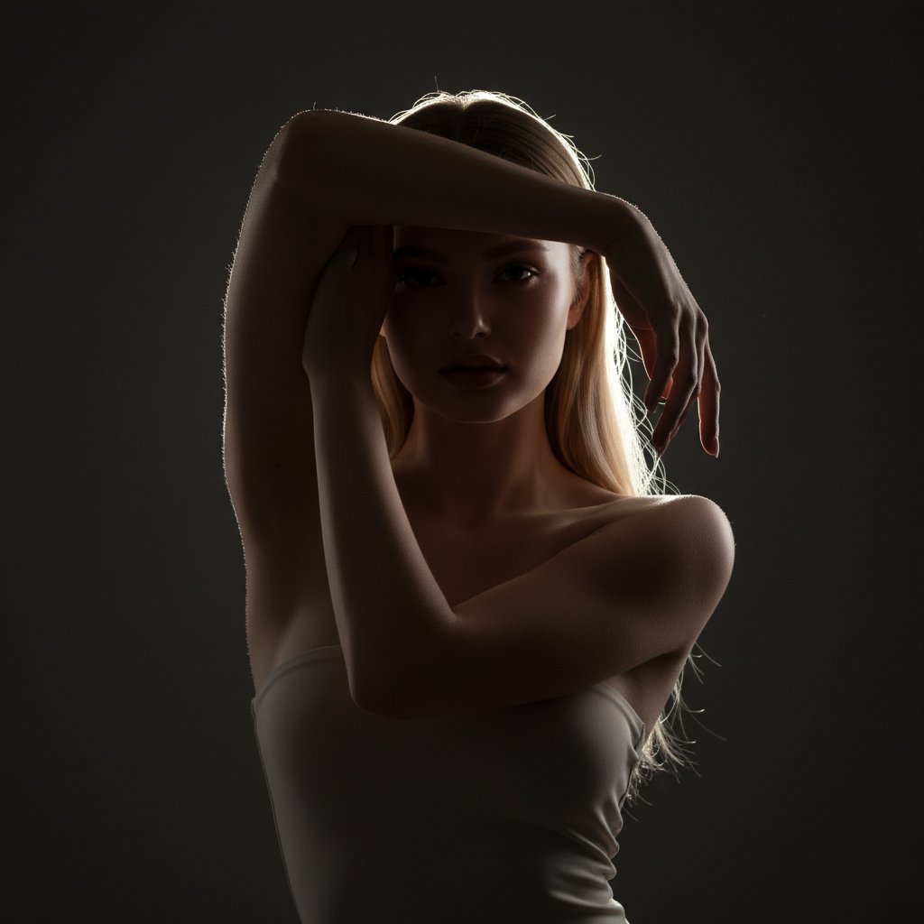 Женская фигура в студийной обстановке, частично прикрытая руками, акцентирует внимание на изгибах тела. Контурное освещение сзади очерчивает силуэт, а взгляд прямо в объектив добавляет интриги. Крупный план, передающий атмосферу таинственности и изящества.