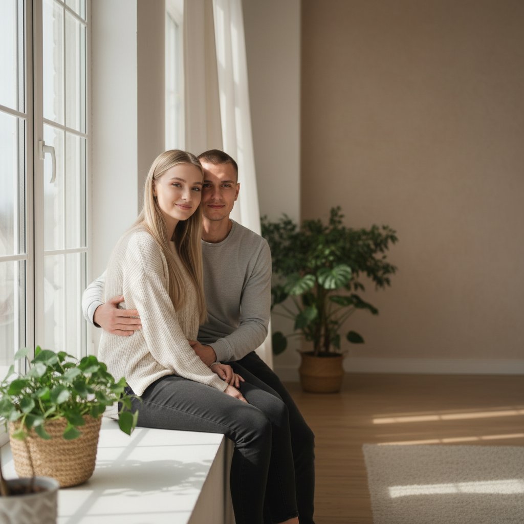 Молодая пара расположилась на подоконнике в просторной, залитой светом студии. Они оба обращены к зрителю, на их лицах нежные улыбки. Между ними чувствуется умиротворение и теплота. Мягкий дневной свет создает уютную атмосферу, интерьер выполнен в нейтральных тонах.