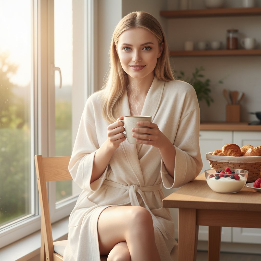 Женщина в светлом халате сидит на стуле возле окна на кухне, держа в руках чашку кофе. На столе рядом — свежая выпечка и йогурт с ягодами. Она смотрит в объектив с легкой улыбкой, мягкий утренний свет окутывает сцену уютом.