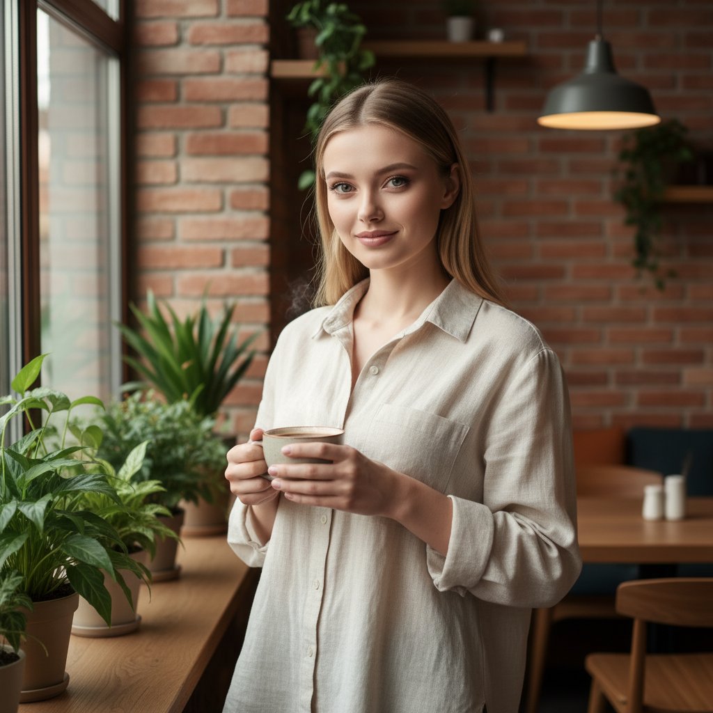 Молодая девушка в светлой рубашке у окна в стильной кофейне, позади кирпичная кладка и комнатные растения, в руках держит чашку с ароматным кофе, смотрит в объектив с легкой улыбкой, общая атмосфера теплая и уютная.