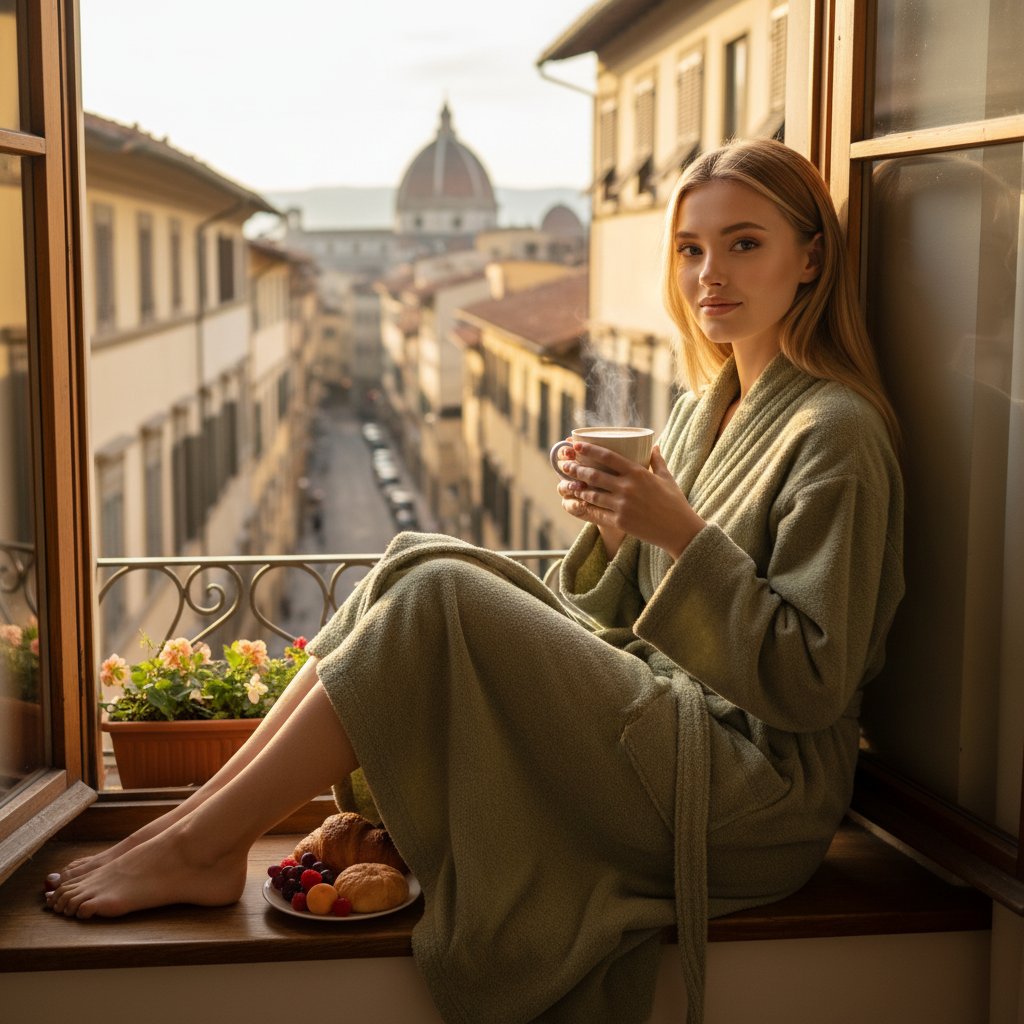Молодая девушка в светло-оливковом домашнем халате уютно расположилась на широком подоконнике. За окном открывается вид на живописные улочки Флоренции. В руках она держит чашку дымящегося латте. На подоконнике рядом с ней лежат бриошь и спелые фрукты. Девушка с легкой улыбкой смотрит в объектив, ее лицо освещено мягким утренним светом, макияж нежный и едва заметный.
