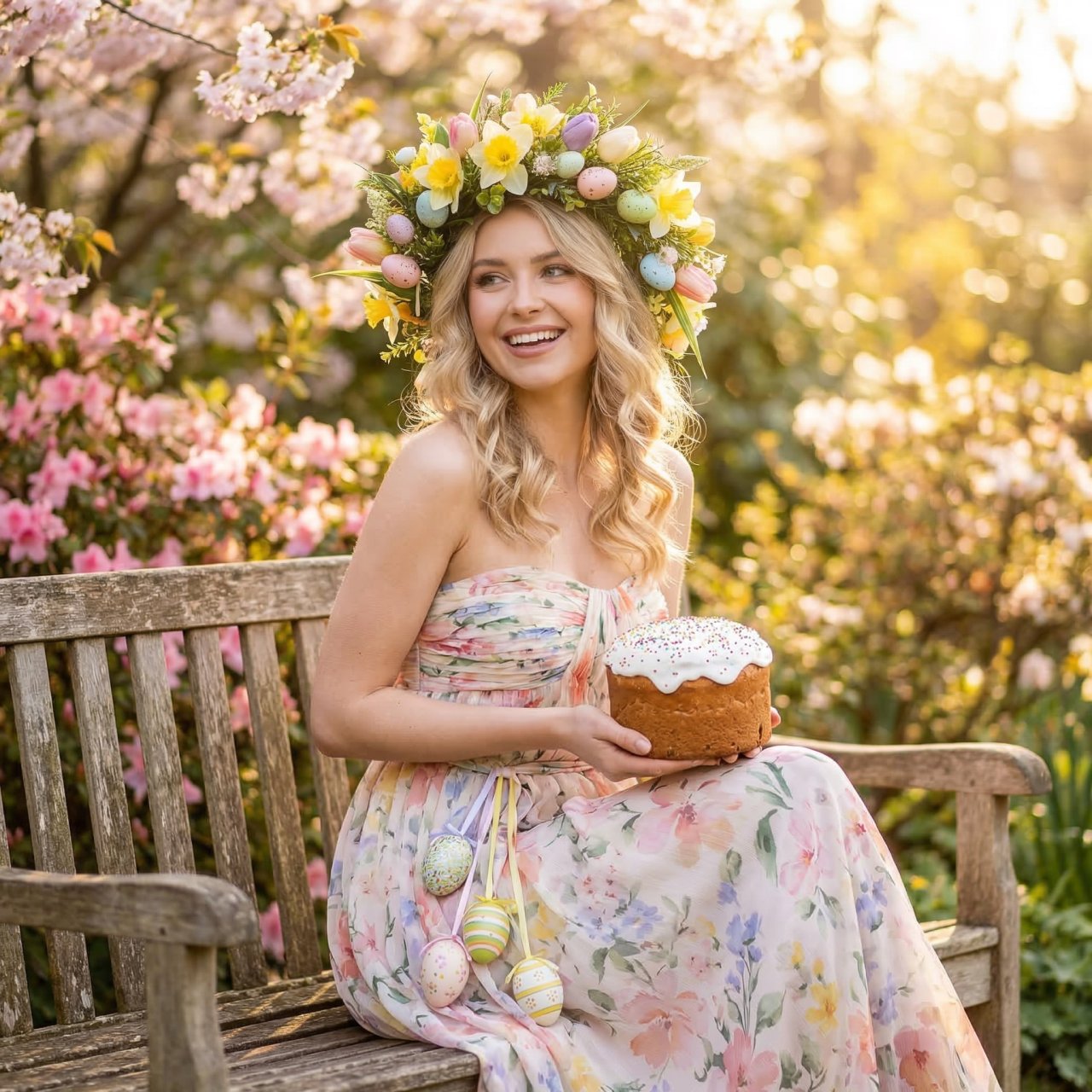 NanoBanana ProСоздай яркий весенний пасхальный портрет молодой блондинки в цветущем саду. Девушка сидит на деревянной скамейке в солнечном саду, держит в руках кулич с белой глазурью и посыпкой. На ней легкое пастельное платье с цветочным узором без бретелей, а на голове роскошный венок из весенних цветов, нарциссов, зелени и декоративных пастельных пасхальных яиц. На поясе также висят разноцветные яйца как праздничный декор. Вокруг — цветущий сад, теплый золотой свет, мягкое боке, весенняя свежесть и сказочная атмосфера. Стиль — dreamy spring portrait, photorealistic, fine art, golden hour, highly detailed, 4k.