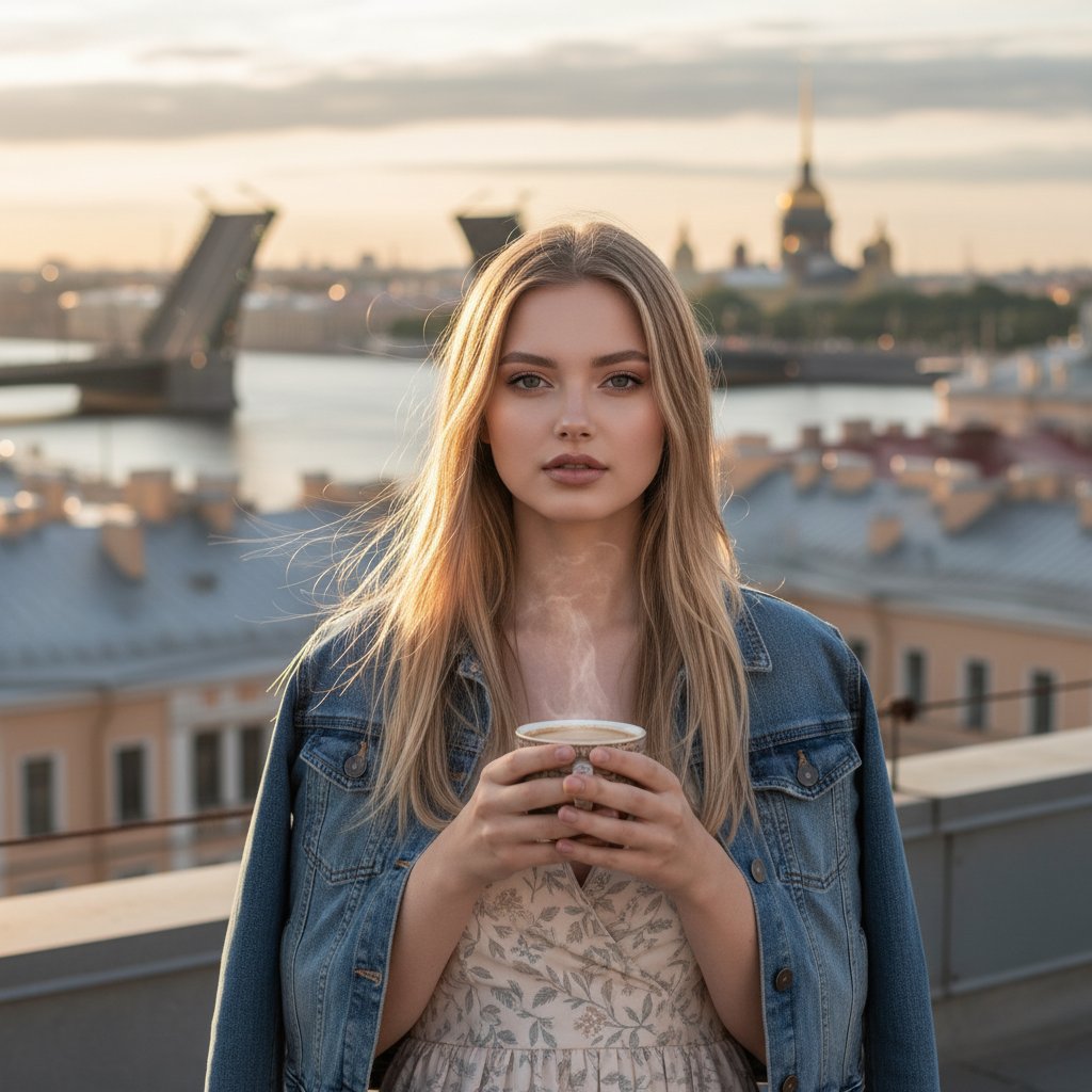 Девушка в джинсовке и летнем платье стоит на крыше, держа чашку кофе. На заднем плане видны разводные мосты и шпили Петербурга. Она смотрит прямо в камеру, ветер развевает её волосы. Снято крупным планом, передавая атмосферу раннего утра.