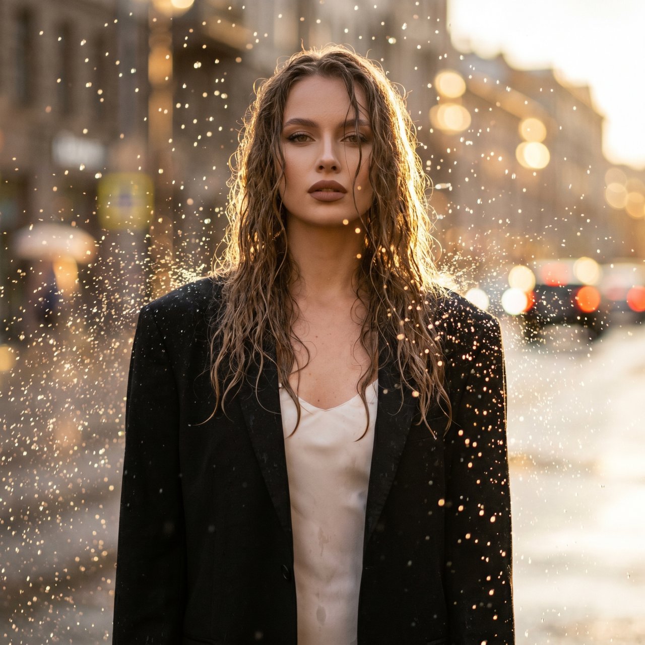 NanoBanana ProСоздай крупный портрет, не меняя черты лица. Атмосферный городской снимок девушки под дождем. Освещенная сзади солнцем (дождь грибной), героиня в молочном платье на бретелях коротком и в оверсайз очень обьемном черном пиджаке. Крупный план летящих капель и брызг воды создает ощущение движения. на заднем плане виден размытый город и теплое свечение фонарей. Волосы длинные влажные волнистые , макияж безупречный, пудрово-коричневые губы. 8К.
