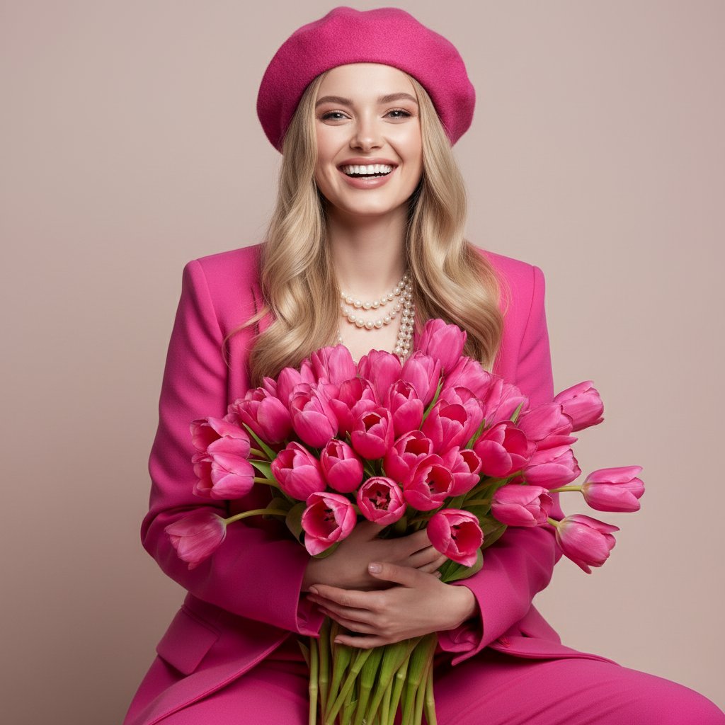 Модная студийная съёмка девушки, сидящей с большим букетом ярко-розовых тюльпанов на светлом розово-бежевом фоне, радостная улыбка, светлые волнистые волосы, ярко-розовый жакет, розовый берет, длинная нить жемчуга, романтичная fashion editorial атмосфера, мягкий свет, clean background, насыщенные розовые акценты, расслабленная поза, реалистичная кожа, ткань и цветы, ultra realistic