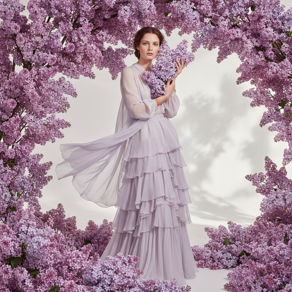 Создай портрет, не меняя черты лица. Фэшн-фотография модели, стоящей среди гигантских ветвей сирени в мягких сиренево-лиловых оттенках, с множеством мелких детализированных соцветий. Она аккуратно подносит к себе пышную ветку. На женщине изысканный наряд в тон: полупрозрачный шифоновый топ с драпировкой и многослойная юбка макси. Монохромная пастельная палитра, светлый студийный фон с мягкими рассеянными тенями. Гиперреалистичный редакторский стиль высокой моды, 8k, высокая детализация тканей и кожи. 9:16