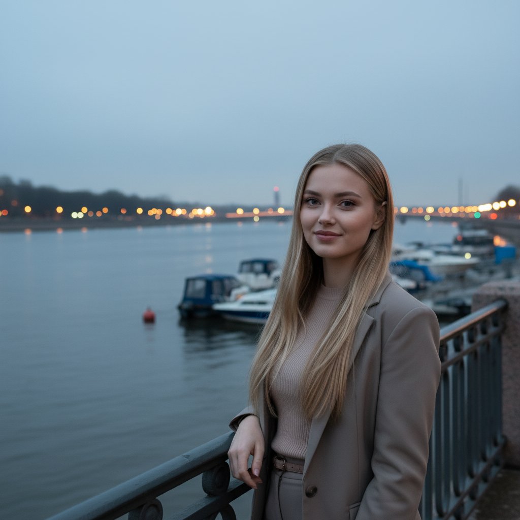 Девушка в модном наряде у ограждения набережной, взгляд в объектив, легкая улыбка. На фоне — гладь реки, мерцающие огни фонарей, пришвартованные лодки. Атмосфера пасмурного вечера, средний план.