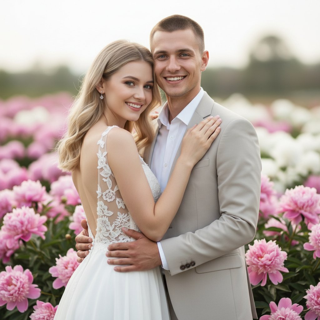 Молодая пара, обнявшись, позирует на фоне цветущих розовых и белых пионов. Девушка одета в изящное белое платье с открытой спиной, юноша — в элегантный светлый костюм и белую рубашку. Оба смотрят в объектив с счастливыми улыбками, передавая весеннее настроение.