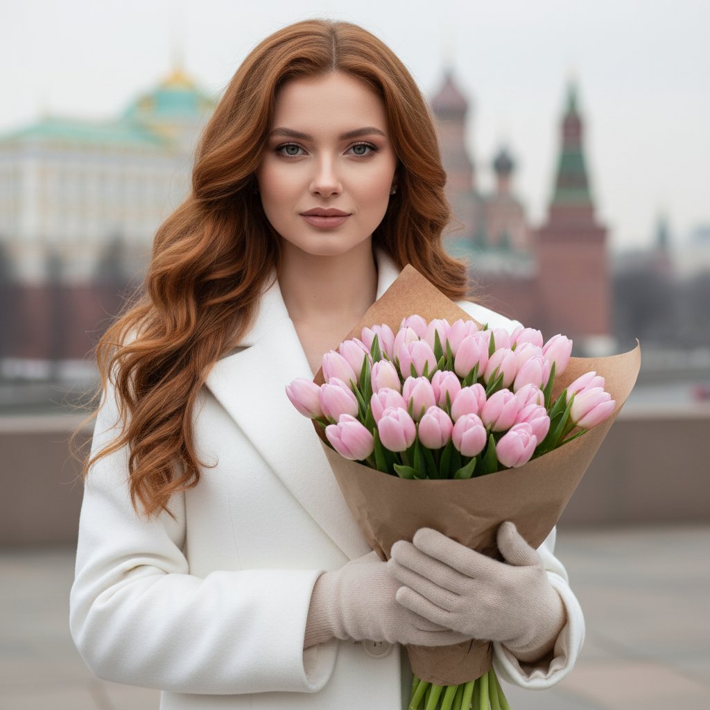 Рыжеволосая девушка с длинными волнистыми волосами в элегантном белом пальто стоит на фоне размытых силуэтов московской архитектуры. В руках она держит объемный букет нежно-розовых тюльпанов, завернутых в крафтовую бумагу.