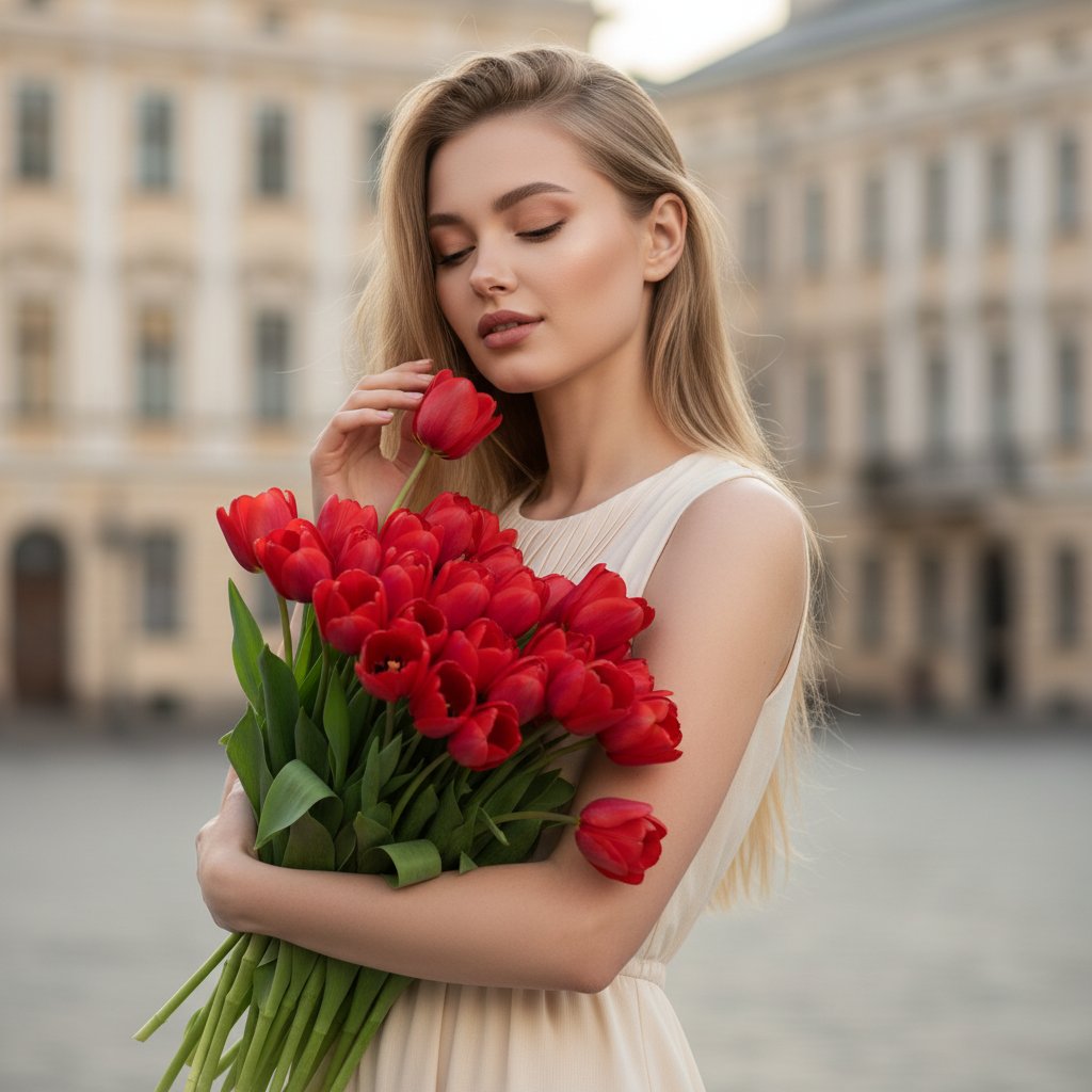 Девушка в летнем платье с пышным букетом алых тюльпанов. Её пальцы нежно прикасаются к бархатистым лепесткам, а глаза закрыты в блаженстве, вдыхая аромат. На заднем плане — нечёткий городской пейзаж с изысканной архитектурой. Снимок крупным планом, акцентирующий внимание на гармонии природы и городской среды.