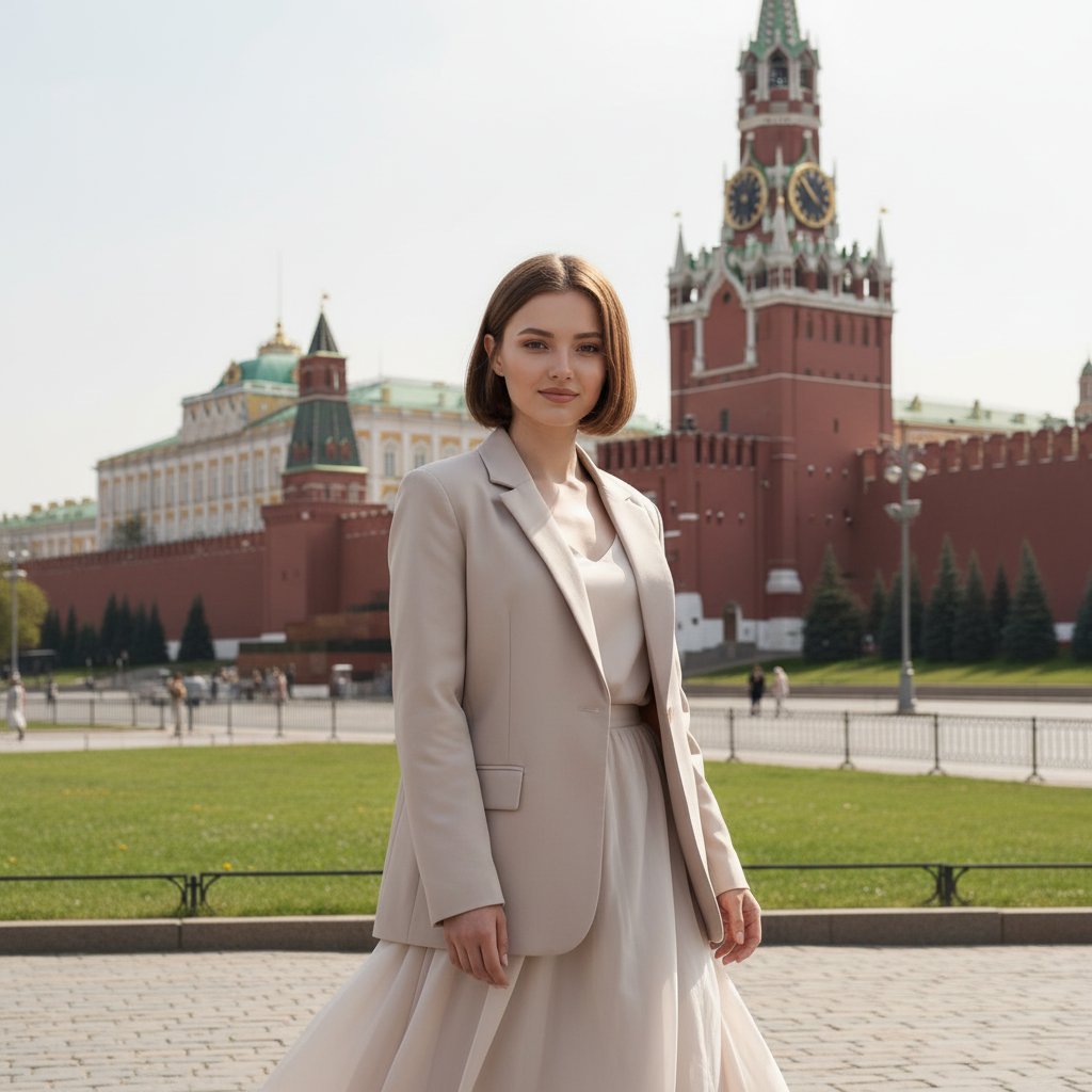 Молодая женщина с короткой стрижкой каштанового цвета, одетая в светлый пиджак и легкую летящую юбку, позирует на Красной площади. На фоне видны стены Кремля и весенняя зелень газонов. Она уверенно смотрит в объектив. День свежий, весенний, с мягким солнечным освещением.