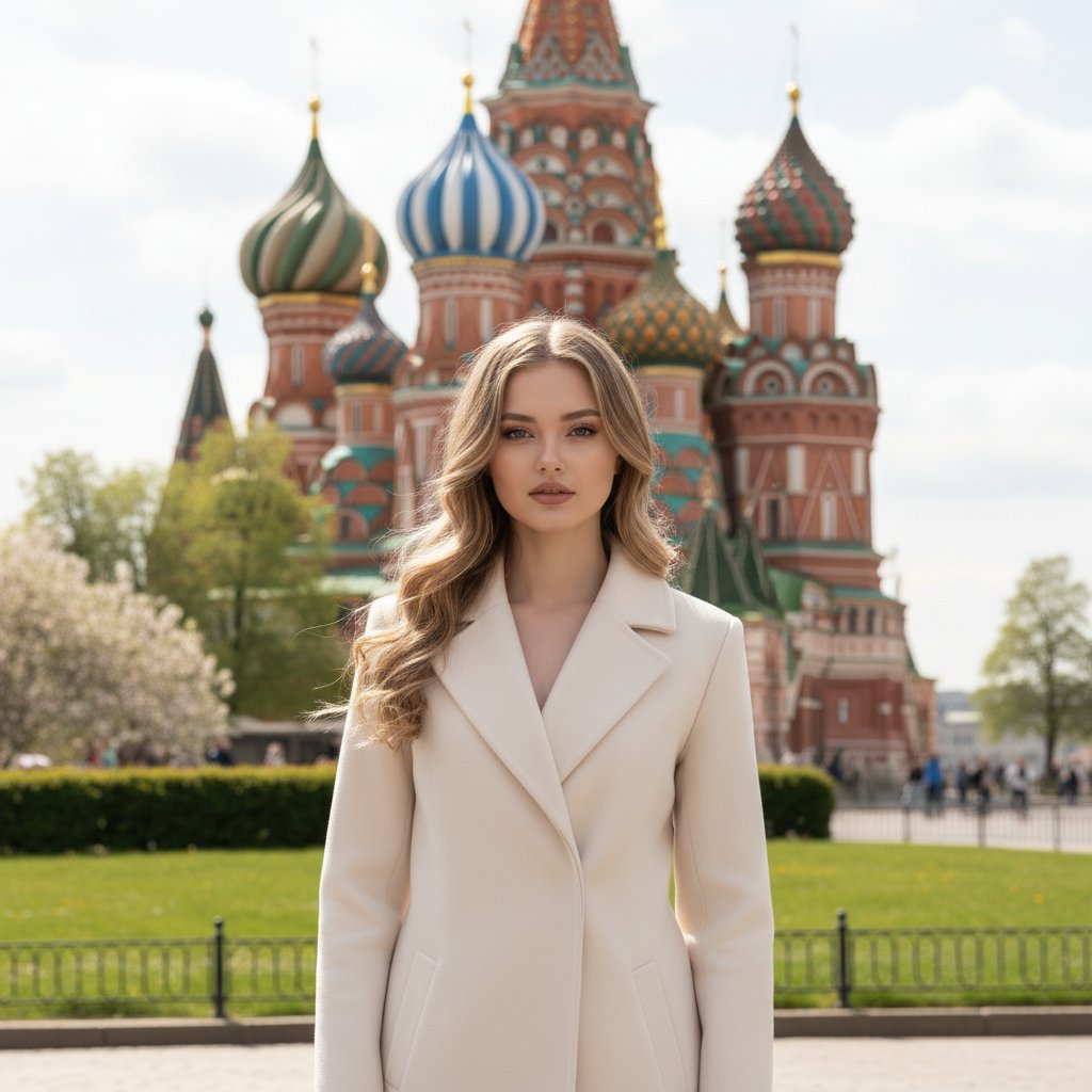 Молодая девушка с длинными светлыми локонами в светлом кремовом пальто стоит на Красной площади. На заднем плане возвышается Собор Василия Блаженного, вокруг свежая зелень. Девушка смотрит прямо в объектив, передавая атмосферу весеннего дня.