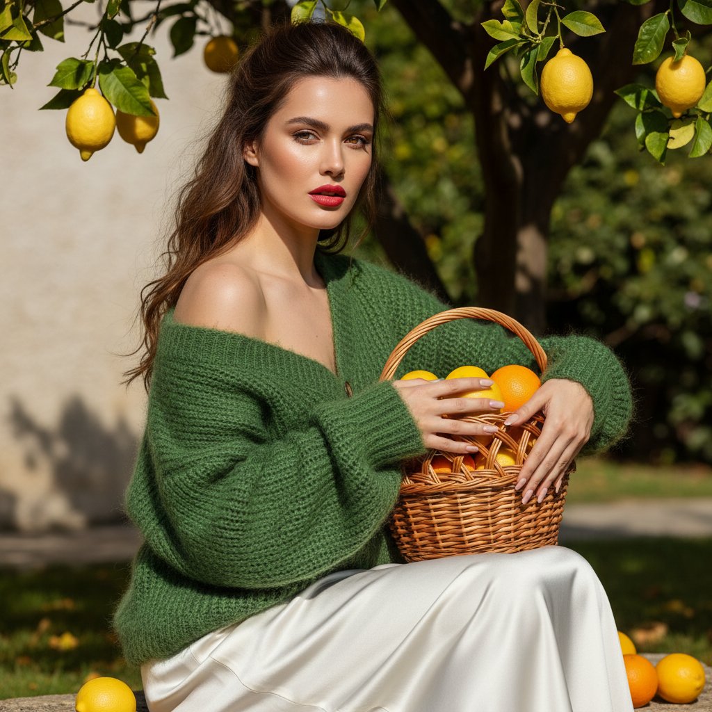 Создай крупный портрет, не изменяя черты лица, Фотореалистичный портрет красивой женщины с выразительными чертами лица, глубокими глазами и ярко-красными пухлыми губами. На ней объемный, свободный пушистый зеленый вязаный кардиган спущенный с плеч. Длинная шелковая молочная юбка. Она сидит под деревом лимона, в руках держит плетеную корзину, полную лимонов и апельсинов, вокруг лежат спелые желтые лимоны и апельсины. Безупречный сюмакияж, волосы длинные волнистые собранны сзади, небрежные пряди у лица. Освещение - яркий солнечный свет с контрастными тенями (кинематографичный свет), создающий атмосферу средиземноморского полдня. Нюдовый квадратный маникюр. Задний план: светлая стена и размытая зелень сада. Высокая детализация кожи, текстуры ткани и плетения корзины.9:16
